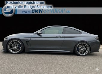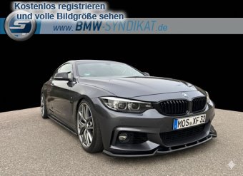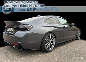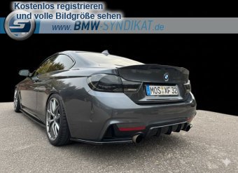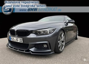 BMW 4er Coupé (F32) - Sportlich und individuell modifiziert Das Fahrzeug ist ein BMW 4er Coupé der Baureihe F32 in einer eleganten, dunklen Metallic-Lackierung. Es verfügt über ein dynamisches M-Paket mit aggressiver Frontschürze, großen Lufteinlässen und einem markanten Frontsplitter. Die Seitenansicht zeigt eine tiefergelegte Karosserie mit sportlichen Mehrspeichen-Leichtmetallfelgen und blauen Bremssätteln, was auf eine leistungsorientierte Bremsanlage hinweist. Am Heck sind ein Diffusor, eine dezente Spoilerlippe sowie eine zweiflutig ausgeführte Sportabgasanlage erkennbar. Die abgedunkelten Rückleuchten und die insgesamt stimmige Optik unterstreichen den sportlichen Charakter des Fahrzeugs.